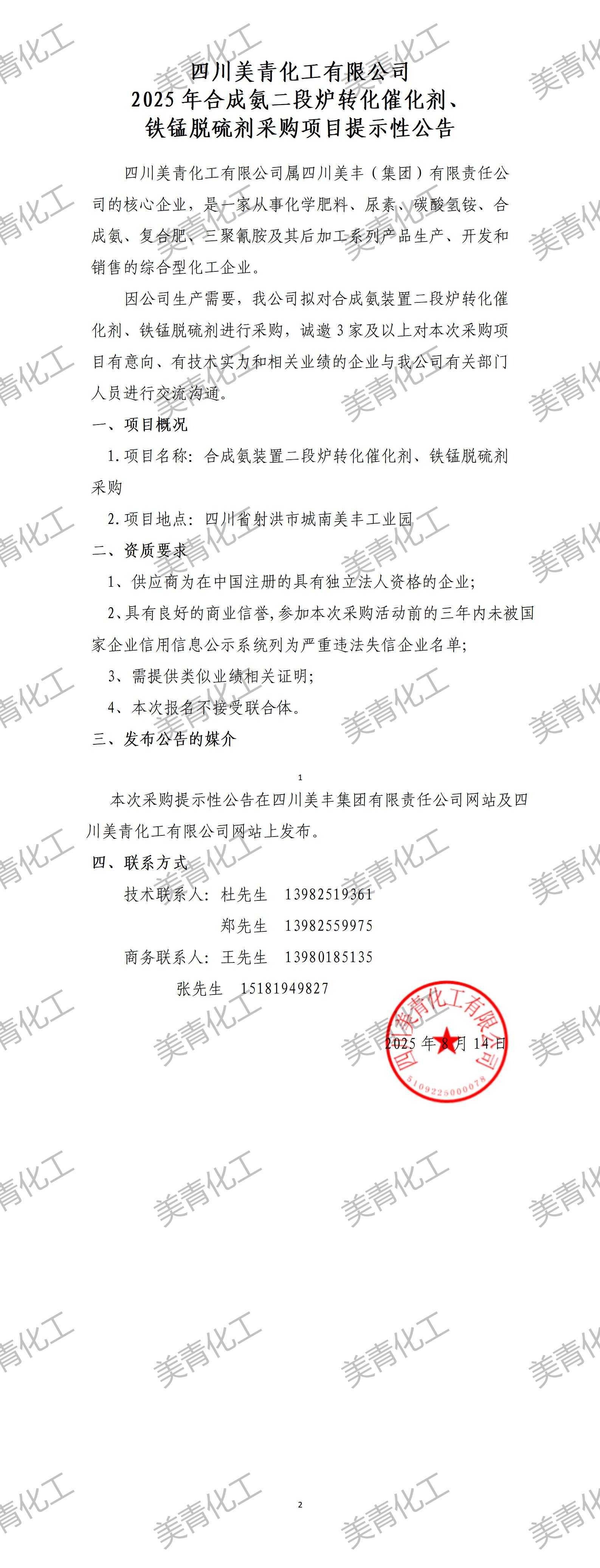 2025年合成氨二段爐轉(zhuǎn)化催化劑、 鐵錳脫硫劑采購項目提示性公告