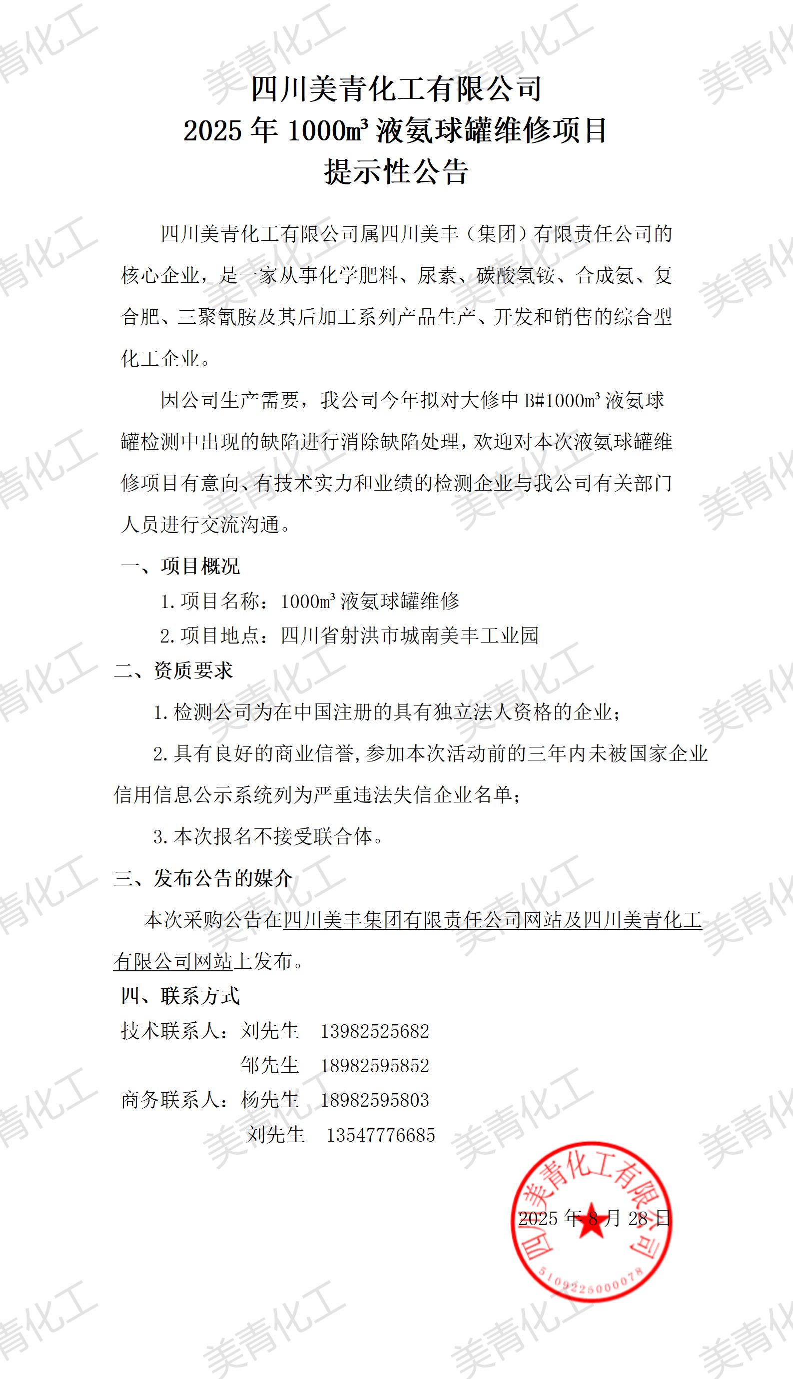 2025年1000m3液氨球罐維修項(xiàng)目提示性公告