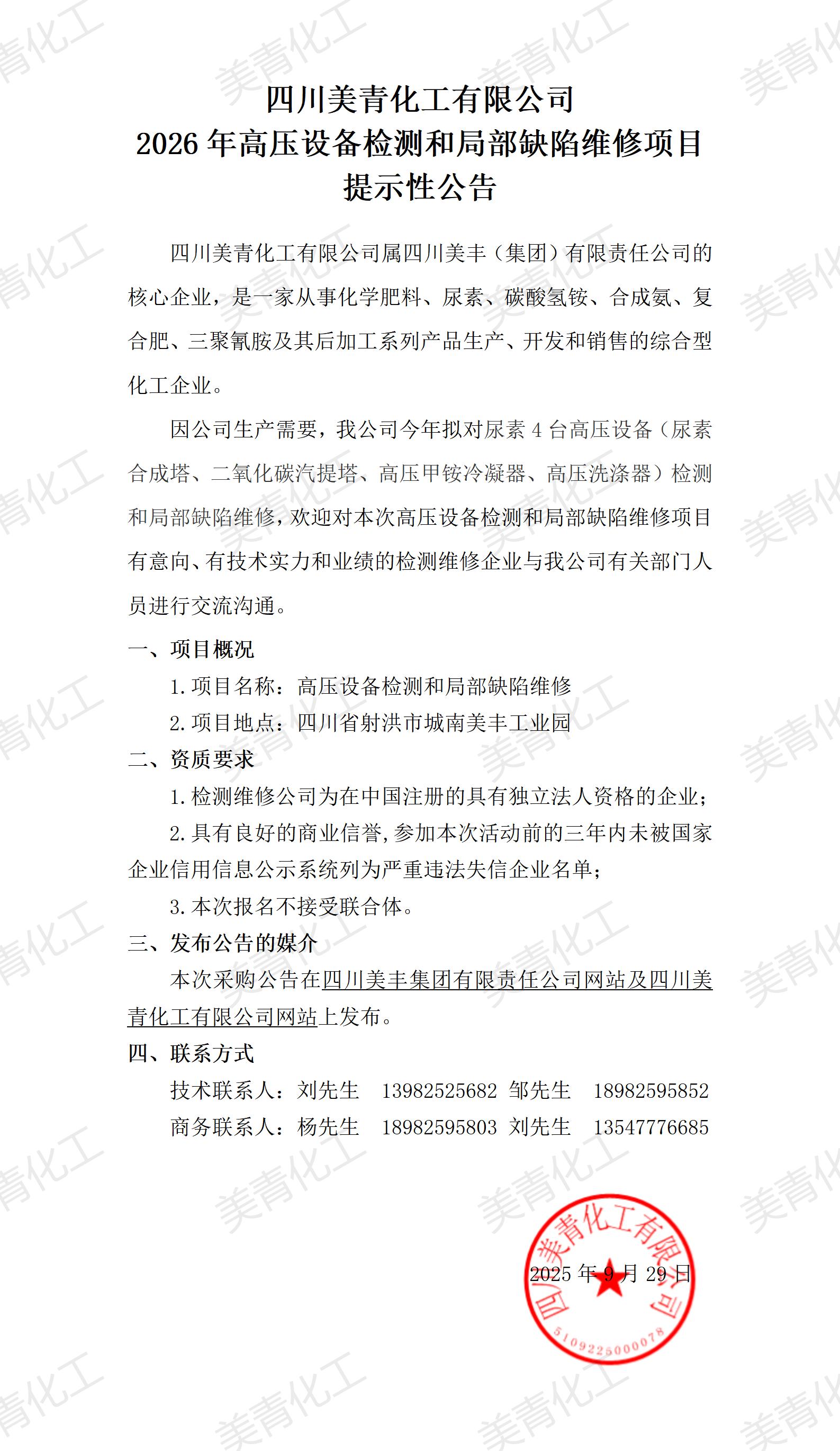 2026年高壓設(shè)備檢測和局部缺陷維修項(xiàng)目提示性公告