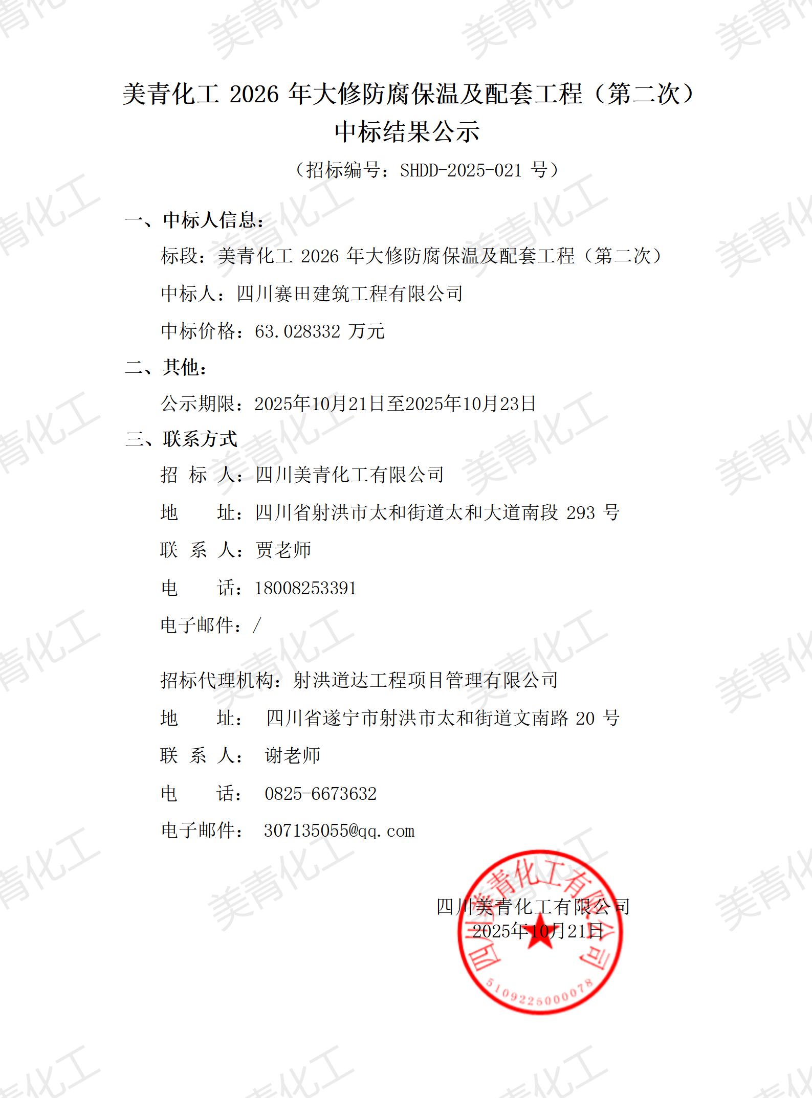 美青化工 2026 年大修防腐保溫及配套工程(第二次)中標結(jié)果公示